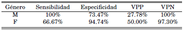250) ppm. Cabe aclarar que se realizó este análisis solo para las 96 muestras de la parte urbana de Viacha, ya que las 12 restantes no eran suficientes para observar la discriminación cuadrática. Para la cuantificación de este análisis se utilizan pruebas de diagnóstico mediante el cálculo de la sensibilidad (proporción de verdaderos positivos que han sido correctamente identificados) y de la especificidad (proporción de verdaderos negativos que han sido correctamente identificados); también se pueden calcular valores predictivos como el valor predictivo positivo (VPP) que es la proporción de pacientes positivos que han sido correctamente identificados o el valor predictivo negativo (VPN) que es la proporción de pacientes nega-tivos que han sido correctamente identificados. Los resultados obtenidos para este análisis se muestran en la Tabla 5.