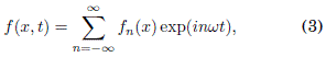 donde fn(x) es la n-esima componente de Fourier del campo electrico f(x, t) de alta frecuencia ω. Por simplicidad suponemos fn(x) = f-n(x), de tal forma que f(x,t) es una funcion real y par con respecto al tiempo t. En nuestro sistema, la frecuencia lo se supone mucho mayor que cualquiera de las frecuencias asociadas a la naturaleza del potencial estatico U(x). Es mas: el promedio temporal sobre el periodo T =