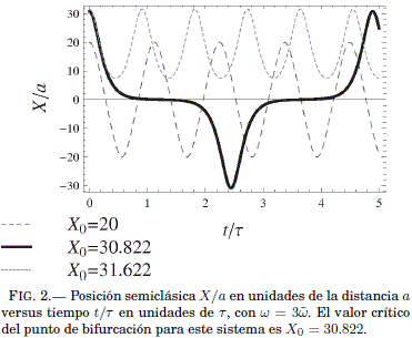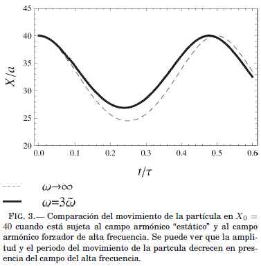 Como se puede ver en la Fig. 1, la distancia entre estos mínimos aumenta al disminuir ω, tal como lo predice la Ec. (29). Debido a la estructura matematica de Ueff(X) en la Ec. (28), la partıcula puede oscilar en dos regímenes diferentes: "el regimen de Bloch" (Gallinar & Chalbaud 1991) donde Ueff(X) tiene dos mınimos y la partcula oscila en alguno de ellos, y "el regimen del continuo" (Longhi 2007; Gallinar & Chalbaud 1991) donde la partícula o bien visita ambos mínimos, o bien oscila en torno a un mínimo en X = 0 cuando X0 <