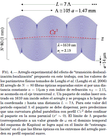 De manera interesante, los resultados teoricos descritos arriba pueden encontrar un escenario experimental donde las predicciones serían confirmadas (o refutadas). Como se menciono al principio de este trabajo (seccion 1), existe una analogía formal entre el comportamiento de un electron moviéndose en una red de enlace fuerte bajo el efecto de campos electromagneticos especficos, y un paquete de ondas fotonico propagándose a lo largo de un arreglo de fibras opticas con perfiles de curvatura específicos. Así, los fenomenos dinámicos cuánticos para el electron en la red (en el dominio temporal) son "mapeados" a lo largo del eje del arreglo de fibras opticas (en el dominio espacial). Esto es posible despues de aplicar la transformación de Kramers-Henneberger a la "ecuación óptica de Schródinger" (Longhi et al. 2006), de lo que resulta