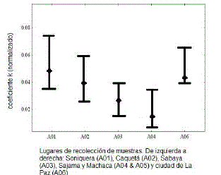 Se encontró que todas las muestras presentan valores similares del coeficiente de conducción térmica, k, tal como se esperaba, ya que las muestras son de una misma especie. Sin embargo, las pequeñas variaciones entre valores nos permitieron diferenciar las muestras por sus lugares de origen, tal como se puede apreciar en la figura 5. El eje horizontal corresponde a promedios de muchas muestras de cada lugar de recolección, y están ordenados por su latitud geográfica, desde el sur (Soniquera) hacia el norte (ciudad de La Paz). Estas últimas muestras (de la ciudad de La Paz) se deben considerar como un caso especial, ya que corresponden a muestras cultivadas, y su régimen de riego no es el natural. Todas las otras muestras provienen de la cordillera, recolectadas en zonas rurales. En el caso de las muestras de Sajama y Machaca, se encontró gran similitud, que es estadísticamente imposible separar los dos grupos; lo cual es lógico por la proximidad de ambos lugares. A pesar de estos casos, se encontró una relación marcada entre el lugar geográfico de origen y el valor relativo del coeficiente de conducción térmica (k) a lo largo de toda la cordillera.