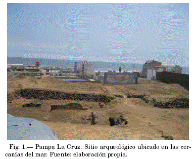 Pampa La Cruz fue un sitio residencial de pescadores ubicado sobre una terraza marina, a unos 350 m de la orilla del mar. El sitio, durante la ocupación Moche, tuvo una extensión de aproximadamente 4 ha. donde el componente principal fueron conjuntos residenciales, posiblemente multifamiliares. En el extremo oeste, los Moche construyeron una plataforma ceremonial de 2 a 2.5 m de alto y unos 484 m2 de extensión. Este edificio fue el resultado de muchas remodelaciones arquitectónicas, donde el elemento central fue una plataforma con rampa que miraba hacia el mar y donde hubo un altar/trono en forma de "U". Las paredes de este edificio fueron hechas con piedras de playa unidas con mortero de barro y enlucidas con un barro más fino, sobre las cuales algunas fueron pintadas con pigmentos principalmente blancos y rojos (Fernandez & Prieto, [2022]).
