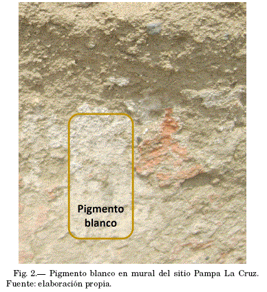 Las muestras arqueológicas (fragmentos de mural con pigmento blanco) fueron recolectadas in situ (figura 2). Luego de esto, las muestras fueron clasificadas y catalogadas.