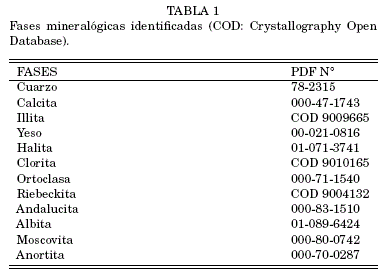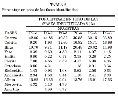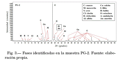 Fueron identificadas fases de cuarzo, arcillas y sales (tabla 1). La figura 3 presenta el perfil de difracción de la muestra PG-2, con la indicación de los picos de cada fase identificada en esta muestra.