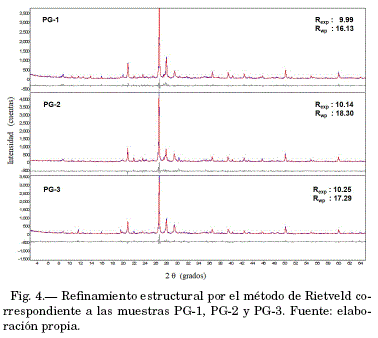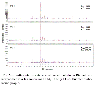 A partir de la identificación de las fases en cada muestra, fueron preparados los modelos estructurales teóricos para el refinamiento por el método de Rietveld. Para cada muestra, el refinamiento confirmó la identificación de cada fase. Las figuras 4 y 5 presentan los resultados, con los factores de ajuste del refinamento (Rexp: factor residual esperado; Rwp: factor residual ponderado). Según la literatura (Toby, [2006]), los valores de estos factores son referenciales para decidir si un ajuste es o no satisfactorio, pero no sustituyen el raciocinio crítico del analista. La tabla 2 presenta el porcentaje en peso de cada fase.