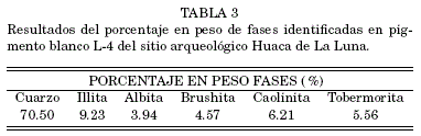 Estos resultados difieren de los obtenidos en investigación anterior respecto al pigmento blanco del sitio Huaca de La Luna. Asimismo, difieren cualitativa y cuantitativamente de nuestros resultados obtenidos en trabajo previo (Zeballos-Velásquez et al., [2013]), los cuales mostramos en la tabla 3.