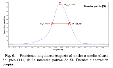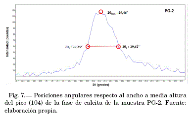 El procedimiento aplicado según el método de Scherrer es ilustrado gráficamente por las figuras 6 y 7. La figura 6 presenta las posiciones angulares respecto al ancho a media altura del pico (111) de la muestra patrón de Si y la figura 7 presenta estas posiciones respecto al ancho a media altura del pico (104) de la calcita en la muestra PG-2.