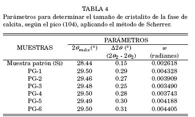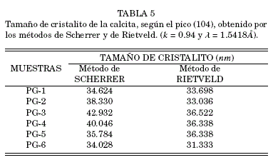 Este mismo procedimiento fue aplicado para la fase de calcita en todas las muestras, cuyos resultados presentamos en la tabla 4. Comparativamente, la tabla 5 presenta los resultados del tamaño de cristalito según el pico (104) de la calcita, obtenidos por los métodos de Scherrer y Rietveld.