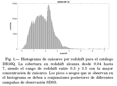 En la figura 1 podemos observar, la distribución de cuásares en función del redshift. Los sesgos que se observan en el histograma, se debe a que el número de cuásares aumentó significativamente en las últimas décadas además de la conjunción de las diferentes campañas de SDSS.