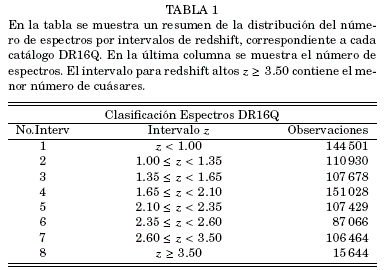 Para mantener cierto control de nuestro procedimiento, tomaremos la clasificación inicial del trabajo de Jensen et al., [2016], que hace una selección completa de cuásares en los intervalos 2.10 ≤ z < 2.35; 2.35 ≤ z < 2.60 y 2.60 ≤ z < 3.50. Aquí extendemos esta clasificación a ocho intervalos de redshift mostrados en el cuadro 1, donde además se muestra el número de observaciones por intervalo de redshift.