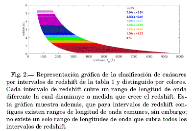 La figura 2 muestra la misma clasificación por intervalos de redshift de la tabla 1, pero ahora mostrando el rango de longitudes de onda cubierto por cada intervalo de redshift y distinguido por colores. En general la muestra completa tiene una cobertura entre 516 Å y 9 681 Å.