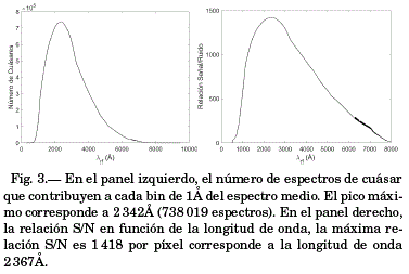 En el panel izquierdo de la figura 3, se muestra el número de espectros de cuásar que contribuyen a cada bin de 1 Å del espectro medio en el sistema en reposo, alcanzando un máximo de 738 019 cuásares en 2 342 Å. Esta cantidad de espectros, genera una máxima relación S/N de 1 418 por píxel (ver panel derecho de la figura 3). En el mismo panel, para longitudes de onda mayores a 6000 Å se observan saltos y discontinuidad esto se debe a que algunos bines del sistema en reposo (re-muestreo) quedan vacíos o muy saturados por la baja cantidad de espectros y cuásares que contribuyen a estos bines.
