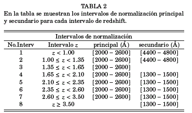 Sea np,j el coeficiente de normalización en el intervalo principal y ns,j el coeficiente de normalización en un intervalo secundario para un mismo espectro j. Para llevar la normalización del intervalo secundario al principal, el coeficiente de normalización ns,j debe ser corregido por el factor c, mediante la operación ns,j ×c. En la tabla 2 se ha resumido los intervalos de normalización para cada uno de los ocho intervalos de redshift. Finalmente, para el intervalo de redshift z ≥ 3.50 que presenta solo un intervalo secundario, es posible aplicarle el factor de corrección calculado en los anteriores intervalos de redshift donde este presente el mismo intervalo secundario.