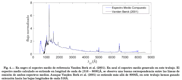 Para evaluar cualitativamente el espectro compuesto obtenido en este trabajo, en la figura 4 en azul, se sobrepone al espectro medio obtenido por Vanden Berk et al., [2001] en negro, se observa buena correspondencia entre ambos espectros medios especialmente en el intervalo de normalización principal [2000-2600] Å, ya que es el mismo en ambos trabajos. Pero también se observa una diferencia vertical en longitudes de onda fuera del intervalo principal, especialmente a mayores longitudes de onda [5000-8000] Å que se atribuye a los diferentes intervalos de normalización secundarios que se utilizó en Vanden Berk et al., [2001].