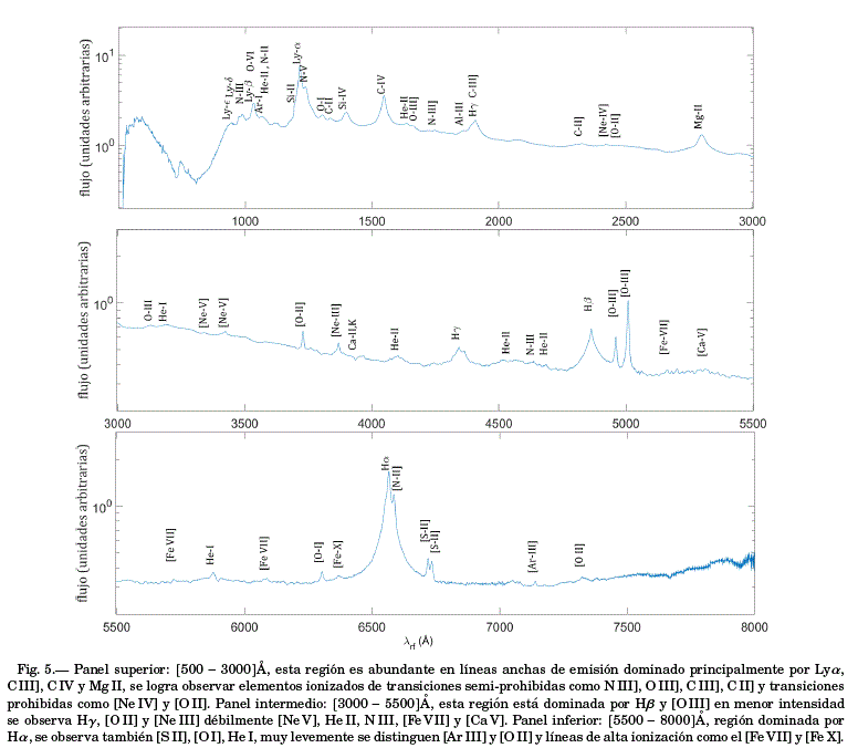 Uno de los tipos de galaxias más luminosos son los cuásares o QSO (del inglés quasi-stellar object) caracterizados por la presencia de agujeros negros supermasivos en su núcleo, con masas entre 104 - 1010 Mº (masas solares) (Beckmann & Shrader, [2012]), y estos dan lugar a fenómenos de altas emisiones de energía alimentados por la gran cantidad de materia que absorben del disco de acreción que los rodea (Kormendy & Richstone, [1995]). Estos procesos generan líneas de emisión asociadas a diferentes rangos de ionización, por ejemplo, en el óptico se suelen caracterizar líneas de alta ionización como el [NeV] λ3426 Å, [FeVII] λ5721 Å, [FeX] λ6375 Å, provenientes de fuentes ionizantes del núcleo galáctico y su interacción con el disco de acreción (Rakshit et al., [2020]). El conjunto de líneas de emisión a lo largo de las longitudes de onda, componen el espectro de un QSO. El análisis del continuo de los espectros y las líneas de emisión, pueden proporcionar información sobre los núcleos de galaxias, por ejemplo, la luminosidad de la línea del [O III] λ5007 Å puede utilizarse como indicador de cuan intensa es su actividad, definiendo así una AGN (del inglés active galactic nucleus).