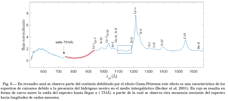 A longitudes de onda por debajo de Lyα, la emisión de la mayoría de cuásares, es absorbida por presencia de hidrógeno neutro en el medio intergaláctico (IGM), lo que hace que el espectro continuo sea mucho más débil. Este hecho es conocido como el Efecto Gunn-Peterson (Becker et al., [2001]) y se lo reconoce por la forma de canal que toma el espectro, ver figura 6 en recuadro azul.