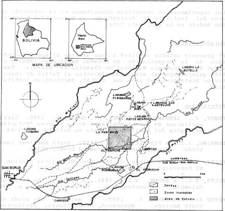 La "Estación Biológica Beni" es un área de protección de vida silvestre que abarca una superficie aproximada de 135.000 ha, ubicada en los llanos nororientales bolivianos, en las provincias Ballivián y Yacuma del departamento del Beni, Bolivia (66º 18' 30'' O, 14º 38' S). Está situada al noreste de San Borja (fig. 1).