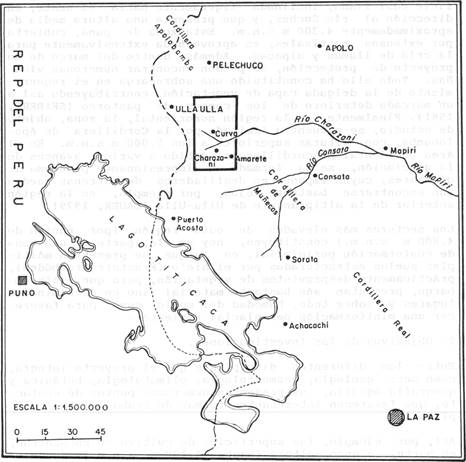 En la región oeste y noroeste, la altiplanicie de Ulla-Ulla forma parte del sector investigado. Se trata de una superficie casi llana, inclinada ligeramente hacia el oeste, en dirección al rio Suches, y que presenta una altura media de aproximadamente 4.300 m s.n.m. Esta zona de puna, cubierta por extensos pastizales, es aprovechada extensivamente para la cria de llamas y alpacas. Además, dentro del marco de un proyecto de protección, se pueden encontrar numerosas vicuñas. Todo ello ha constituido una sobrecarga en el requerimiento de la delgada capa de vegetación, contribuyendo asi a un marcado deterioro de los campos de pastoreo (SEIBERT, 1981). Finalmente, en la región nororiental, la zona, objeto de estudio, se encuentra limitada por la Cordillera de Apolobamba, con alturas superiores a los 5.000 m s.n.m. En el área occidental precordillerana, debido a varios avances de la glaciación, se ha formado un impresionante panorama de glaciares, cuyos imponentes desfiladeros de morrenas pueden aún encontrarse bastante lejos, por ejemplo, en la región anterior de la altiplanicie de Ulla-Ulla (LAUER, 1979).