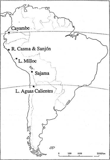 El imperio incaico se estableció hace unos 550 años y llegó en su extensión máxima entre los 26°S y 6°N, poco antes de la conquista española. Con anterioridad, en la misma región, ya se habían desarrollado otras culturas andinas, por lo que es posible admitir la ocurrencia de cambios notables en el uso de la tierra y en las circunstancias de vida en general. El objeto del presente estudio es lograr una aproximación a las raíces paleoecológicas de los fenómenos culturales. A través del análisis de pólenes y esporas se busca una visión retrospectiva de los últimos 5.000 años1), con la intención de conocer la repartición de las plantas características y por lo consiguiente el clima correspondiente. A este respecto, surgen las siguientes interrogantes: