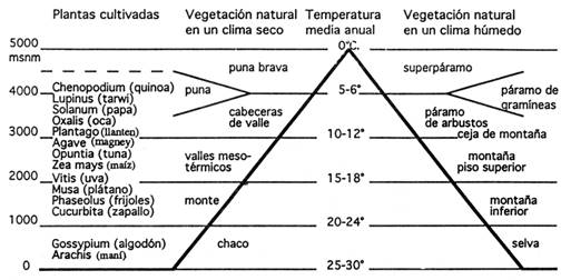 La exposición anterior deja ver que en los Andes tropicales se hace necesario tener en cuenta las grandes diferencias altitudinales. Adicionalmente, es necesario considerar las fuertes variaciones diurnas de temperatura, ya que hacen que el bosque de la montaña se restrinja a alturas inferiores a los 3.000 msnm en el Perú septentrional, a veces a unos 3300 m en latitudes altiplánicas. Por el contrario, las temperaturas anuales varían poco, lo que permite una delimitación bien definida de los pisos altitudinales. En realidad, el régimen de las temperaturas fija la secuencia típica de la vegetación, la que se presenta de forma resumida en la fig.2 para regiones húmedas, regiones secas y para áreas de cultivo. Se refieren sólo aquellas plantas que tienen cierta importancia palinológica.