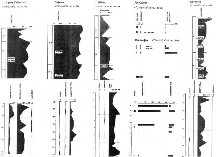 Con el análisis de polen se trata de conseguir unas informaciones sobre la densidad y la edad de la vegetación. Con tales aspectos cuantitativos se podrían obtener conclusiones sobre el uso de la tierra, directamente, o sobre el paleoclima y con esto sobre las posibilidades y condiciones de la agricultura, indirectamente. Para facilitar comparaciones, los resultados palinológicos se presentan de forma comprimida en la fig. 3 (ver también Graf, 1992). Uno se da cuenta que las gramíneas dominan completamente en regiones áridas (Aguas Calientes, Sajama), que las compuestas se presentan en porcentajes elevados en todos los perfiles, mientras que las cantidades de polen del aliso (Alnus) varían mucho; por ejemplo, están prácticamente ausentes en Aguas Calientes, y de ahí aumentan poco a poco hacia el Norte, porque este arbolito prefiere un clima húmedo. En el caso de Sajama, los parámetros palinológicos indican que el clima hace 2.500 años era algo menos húmedo que hoy, pero hace 4.100 años algo más húmedo. El diagrama de Milloc deja ver que el clima fue un poco más seco que el actual en todas las zonas del diagrama, es decir en el Holoceno temprano y media, aunque las condiciones no alcanzaron las de una completa aridez. El diagrama de Cayambe, que actualmente corresponde al páramo húmedo, contiene más polen del aliso, y el clima fue especialmente húmedo hace 5.000 años, mientras que hace 2.000-2.500 años reinaba un clima un poco menos húmedo que el actual.