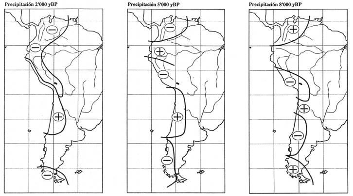 S. Servant (1982, p. 182) menciona la presencia de diatomeas lacustres de 3.500-3.000 AP en el Altiplano boliviano; esta ocurrencia indicaría un clima probablemente más húmedo, y seguramente más frío que el actual . No está claro si esta fase relativamente húmeda fue causada por la intensificación del invierno o sólo era el resultado de un enfriamiento (com. personal de M. Servant). No obstante la duda, es importante saber que en este período se produjo un cambio abrupto en el clima. En comparación con la situación reinante en 5.000 AP, el clima en el Altiplano y en el litoral chileno-peruano se hizo más húmedo, y la tendencia al incremento se mantuvo hasta el presente. Recientemente, a partir de unos 500-1000 AP, la influencia de El Niño se debilita, este hecho acompaña la desertificación de la puna de Atacama y del litoral peruano. De acuerdo con la escasa información disponible, las regiones montañosas y subandinas del Perú y de Bolivia han experimentado sólo pequeños cambios climáticos, con excepción, quizá, de la ocurrencia de un período lluvioso que se ha acentuado durante el Holoceno tardío.