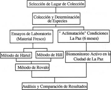 El estudio comprendió el diseño y desarrollo de etapas importantes para la estandarización de una metodología para el uso de líquenes del valle de La Paz como indicadores de contaminación atmosférica (Fig. 1).