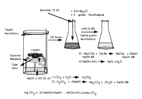 Fig. 4: Representación esquemática de la determinación de respiración de líquenes por el método de Rovalo y Rojas (1982).