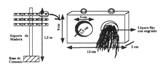 Con las mismas especies se hizo un ensayo de biomonitoreo activo en la ciudad de La Paz, de acuerdo con Hale, (1983) y modificando las especificaciones técnicas del Verein Deutscher Ingenieure para evaluación de calidad del aire con exposición controlada de líquenes (VDI, 1991) (Figura 5). Se trabajó con muestras de líquenes "aclimatadas” seis meses en el Campus Universitario de la UMSA en La Paz (Cota Cota). Se establecieron tres estaciones de biomonitoreo en el eje troncal de la ciudad de La Paz: Plaza Perez Velasco (Casa de la Cultura), Plaza Isabel la Católica y Seguencoma (Predios Min.Agricultura). Durante un mes se efectuó el ensayo de biomonitoreo activo, evaluando cada semana los parámetros de reacción: síntomas visibles y variaciones en la respiración medida con el método de Rovalo y Rojas (1982).