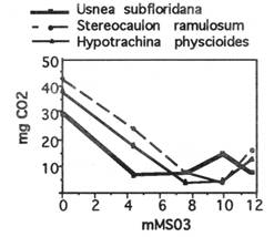 Stereocaulon ramulosum (Sw.) Rausch. es la especie con comportamiento más regular que muestra una relación inversa, casi lineal. Es la especie, aparentemente, más resistente, pero experimenta una reducción en la producción de CO2 de alrededor del 44,3% con la concentración más diluida, 82% con la segunda y 91% con la tercera concentración del experimento.
