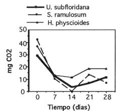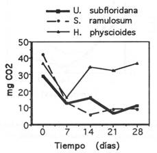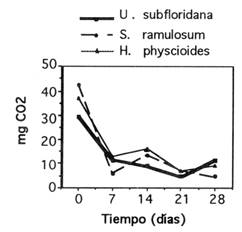 Usnea subfloridana es la especie con comportamiento más regular muestra una tendencia casi lineal en la disminución de la respiración, en el orden del 88%, en las primeras dos semanas de exposición, para luego manifestar una tendencia definida hacia el incremento hasta alcanzar valores de producción deC02 de alrededor de 11 mg. en las 36 horas de prueba.