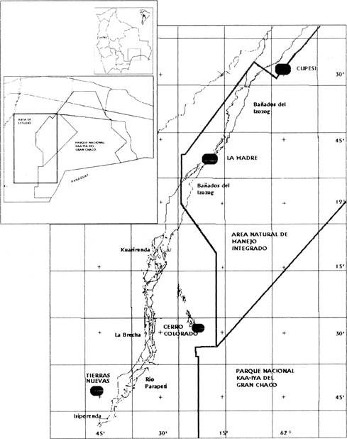 Entre los meses de julio y noviembre de 1996 se realizaron evaluaciones de la biodiversidad del Chaco, provincia Cordillera, departamento Santa Cruz. Un equipo de biólogos y parabiólogos Izoceños visitaron cuatro sitios diferentes (ver Figura 1) haciendo muestreos de la diversidad de fauna durante tres semanas en cada sitio. Los dos primeros sitios se ubican en hábitats que se llaman localmente “monte bajo” o “choroquetal:” Tierras Nuevas al oeste del río Parapetí en el Alto Izozog (19° 43' 21" S, 62° 48' 51" O), y Cerro Colorado al este del río Parapetí en el Bajo Izozog (19° 28' 56" S, 62° 21' 35" O). Durante los meses secos (junio a noviembre) no existen fuentes con agua, y no llovió durante el trabajo de campo. Los dos últimos sitios se ubican en el “monte alto” de los Bañados del Izozog, también dentro del Area de Manejo Integrado del Parque Nacional Kaa-Iya: La Madre (18° 52' 27" S, 62° 21' 31" O) y Cupesí (18° 28' 42" S, 62° 04' 54" O). En tiempo de lluvia estos sitios se inundan por el rebalse del río Parapetí, y en tiempo seco quedan lagunas permanentes con agua. También empezaron las lluvias durante el trabajo de campo en estos dos sitios. El promedio de precipitación anual en todos los sitios es entre 500-600 mm (Gonzalo Navarro, com. pers.).