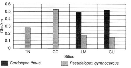 Los datos de huellas en brechas barridas indican que hay muy pocos zorros patas negras Cerdocyon thous en el monte bajo del Alto y Bajo Izozog, donde son abundantes los zorros patas amarillas Pseudalopex gymnocercus. Pero en zonas de monte alto, donde hay los dos zorros, Cerdocyon thous es el más abundante, y logra densidades parecidas a las de Pseudalopex gymnocercus en monte bajo: se observan huellas de la especie más abundante cada 2,0 km de brecha barrida (Figura 2). Las diferencias son estadísticamente significativas entre sitios por cada especie (p ≤ 0,05), y entre especies por los cuatro sitios (p ≤ 0,001). Por caminatas nunca se observó Cerdocyon thous en Tierras Nuevas y Cerro Colorado, tampoco se observó Pseudalopex gymnocercus en Cupesí.