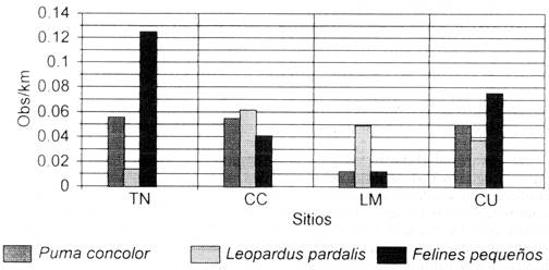 Fig. 3: Observaciones por kilómetro de brecha barrida de gatos Puma concolor, Leopardus pardalis y Felinos pequeños (Oncifelis geoffroyi, Herpailurus yaguarundi, y Leopardus wiedii) en los cuatro sitios.