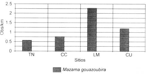 Fig. 4: Observaciones por kilómetro de brecha barrida de hurina Mazama gouazoubira en los cuatro sitios.