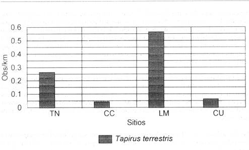 Fig. 5: Observaciones por kilómetro de brecha barrida del anta Tapirus terrestris en los cuatro sitios.