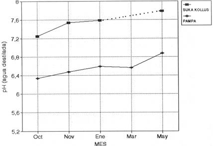 Los suelos de pampa en extracto acuoso tienen un pH medianamente ácido a neutro con valores que van desde 5,50 a 7,0 según clasificación de Thompson (1980). Estos valores de pH son considerados adecuados para fines agrícolas y no se presenta toxicidad de Mn y Al (Van Lierop 1990). En la figura 1, puede observarse que el valor medio del pH correspondiente a la totalidad de parcelas de pampa, sufre un incremento entre el inicio y final de campaña, sin embargo, las fluctuaciones entre las distintas parcelas, impiden considerar este aumento como estadísticamente significativo. La diferencia en el comportamiento del pH entre sistemas suka kollus y pampa puede atribuirse a la distinta concentración de materia orgánica en la capa arable (el valor medio para este parámetro se situa alrededor de 2% para suka kollus y 4% para pampa), a un régimen de agua distinto y a variaciones en la concentración y composición de las sales presentes. Al igual que en el caso de suka kollus, no se observa influencia de las distintas dosis de estiércol en el valor del pH.