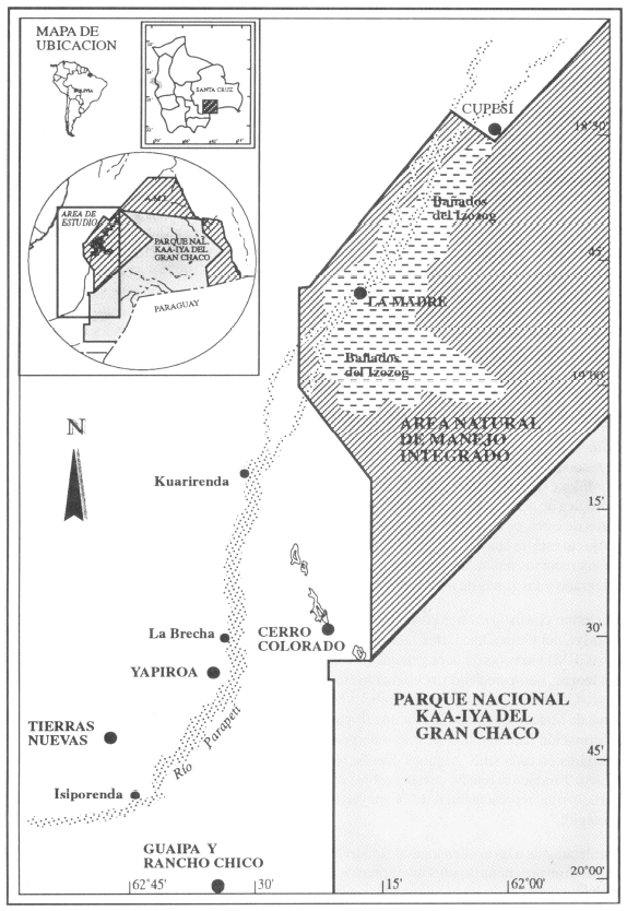 El Chaco boliviano no contaba con ningún sistema de protección hasta septiembre de 1995, cuando se creó el Parque Nacional y Area Natural de Manejo Integrado Kaa-Iya del Gran Chaco. Esta reserva de 3,44 millones de hectáreas se constituye en una de las áreas protegidas más grandes del continente (Taber et al., 1997). Además, abarca gran parte de la última extensión de bosque seco en Sudamérica con un potencial de conservación.