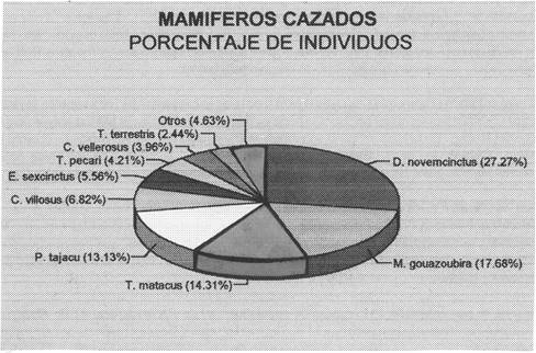 Fig. 1: Cacería de mamíferos - porcentajes de individuos por especie.