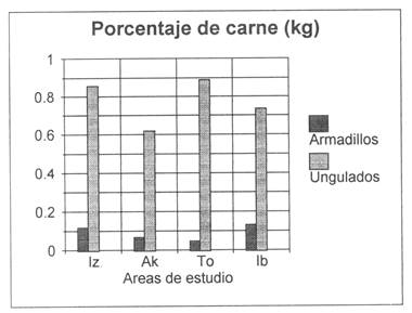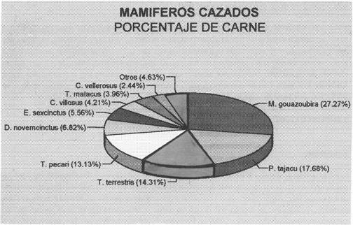 Fig. 2: Cacería de mamíferos - porcentaje de carne por especie.