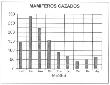 La Figura 7 indica datos de mamíferos cazados por mes, y se ve una disminución importante cuando empiezan las lluvias en noviembre. La importancia de la cacería vuelve a crecer solamente a partir de abril en la estación seca.
