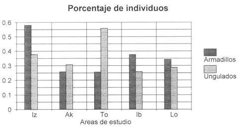 La cacería en el Izozog se pude comparar a la de otros pueblos del Oriente Boliviano: Guaraní, Ayoreo, Sirionó y Chiquitano. Se ve que todos los pueblos dependen para su subsistencia en gran parte de los ungulados y armadillos (Figuras 8a-8b). En términos de individuos cazados, los armadillos son mucho más importantes para los Izoceños (casi 60% de los mamíferos) que para otros pueblos indígenas (25-38%). Para todos los pueblos indígenas, los ungulados proveen entre 60-90% de la carne de monte. En algunos casos, hay diferentes especies explotadas porque estas especies existen en algunas zonas y no en otras, por ejemplo el ciervo Blastocerus dichotomus, muy importante para los Sirionó (Townsend, 1996), pero que no existe donde viven los otros grupos. En otros casos, son diferentes especies las que se comen, por ejemplo la explotación importante de petas por los Ayoreos (Ayala, 1997), y la cacería de monos por los Chiquitanos y Sirionó (Guinart, 1996;Townsend, 1996). Otros estudios han registrado mucho más cacería de aves que en el Izozog, porque incluyen la cacería por los niños (Cuéllar, 1997).