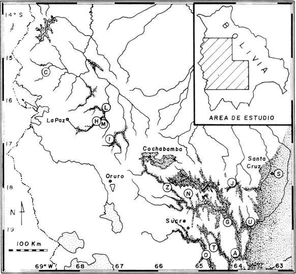 1) Consata (C, ver Fig. 1), depto. La Paz, provs. Saavedra y Muñecas (15°23'S, 68°31'W; 1000-1400 m; 30/5-3/6/1995): un valle andino muy estrecho cuya topografía y la influencia de los vientos secos (Troll 1952) generan un cambio brusco en la vegetación de matorrales espinosos a bosques húmedos montanos en tan sólo unos 10 km dentro del valle, limitando los bosques deciduos al área intermedia de las laderas. Se levantaron 13 relevamientos en bosques zonales poco disturbados.