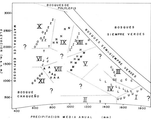 En la tabla 1 se evidencia claramente un ordenamiento de los tipos y grupos de arriba a la izquierda hacia la derecha abajo. Para una interpretación ecológica de este patrón hemos ordenado los relevamientos y los tipos de vegetación en relación a la elevación y la precipitación media anual (Fig. 2). Estos son los factores principales que determinan la vegetación zonal (Walter 1973,Lauer 1986). Se observa que el ordenamiento obedece principalmente a un gradiente de elevación (de elevaciones menores a mayores) combinado con un gradiente de precipitación (de húmedo a seco). La interacción de ambos factores resulta en un patrón algo difuso y no podemos deducir claramente cuál de ellos sea el principal. Sin embargo, la subdivisión de ciertos tipos de vegetación en subtipos obedece en todos los casos a factores de humedad, lo que sugiere que este sea el factor subordinado. Esto no significa necesariamente que la elevación sea un factor más importante que la precipitación en la determinación natural de la vegetación zonal. Nosotros creemos que la dominancia aparente de la elevación se deba a la selección subjetiva de lugares de estudio y que la inclusión de otras localidades podría resultar en un patrón diferente. Probablemente la elevación (y los factores correlacionados: temperatura, insolación, etc.) y la humedad tengan una influencia similar en la determinación de la vegetación natural de los valles secos de Bolivia.