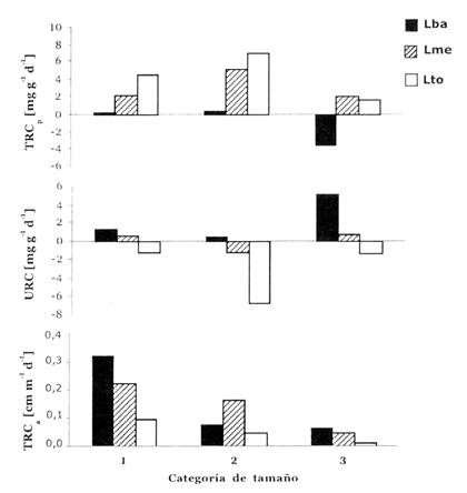 Fig. 1: Tasa relativa de crecimiento en peso (TRCp), uso relativo del cotiledón (URC) y tasa relativa de crecimiento en altura (TRCa) de plantines de B. excelsa de tres categoría de tamaño (1, 2, 3) en tres condiciones de luz (Lba, Lme, Lto). Vea sección Métodos para la interpretación de los valores de URC.