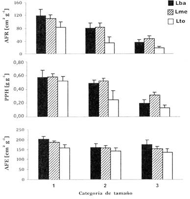 Al inicio del experimento existieron grandes diferencias en tamaño y morfología entre las categorías. Las diferencias en altura, peso seco total y área foliar en la categoría 1 fue aproximadamente seis veces menor que en la categoría 3; también el AFR y proporciones de biomasa variaron considerablemente entre categorías (Tabla 1). Esta variación en fase de desarrollo de las plantas (ontogenia) influyó en el crecimiento y la morfología de los plantines en varias maneras. La tasa relativa de crecimiento en altura (TRCa) fue significativamente menor en plantines más grandes (P < 0,01; Fig. 1). La tasa relativa de crecimiento en peso seco (TRCp) de la categoría 2 fue más alto, y esta categoría también mostró el aumento más grande en TRCp a mayor intensidad de luz. Inversión en área foliar y biomasa en las hojas (AFR y PPH) fue diferente entre las categorías (Tabla 1, Fig. 2) y la reacción de estos parámetros en relación a las diferentes intensidades de luz varió entre categorías, como indica la interacción significativa en el ANDEVA (Tabla 3). Esta variación en reacción puede atribuirse a las diferencias en área foliar y dinámica de hojas (Fig. 3), así los plantines más grandes tenían ganancia de hojas más baja en Lto y Lba que los pequeños.