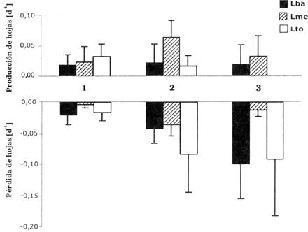 Fig. 3: Producción y pérdida de hojas por día (promedio y desviación estándar) de plantines de B. excelsa en tres categorías de tamaño (1, 2, 3) creciendo bajo tres tratamientos de luz (Lba, Lme, Lto).