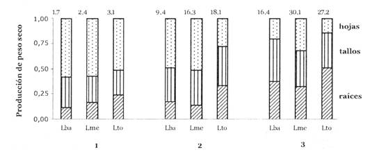 Fig. 4: Asignación de biomasa promedio a diferentes partes de la planta (excluyendo cotiledón) en platines de B. excelsa de tres categorías de tamaño (1, 2, 3) creciendo bajo tres niveles de luz (Lto, Lme, Lto). Los valores indicados sobre las columnas representan el peso seco promedio de cada tratamiento en gramos, sin peso de cotiledón.