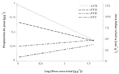 Fig. 5: Patrones ontogenéticos en plantines de B. excelsa. Regresiones lineales de proporción de área foliar (AFR) y proporciones de peso seco de diferentes partes de la planta, con relación al peso seco total de las plantas (log-transformado y excluyendo peso de cotiledón) de plantines creciendo en el tratamiento Lme y plantines cosechados en el comienzo del experimento (n = 45). No se muestran los valores mismos por razones de claridad. Todas las regresiones son significativas (P < 0,001). Ecuaciones: AFR= -50x + 127 (R 2 = 0,74); PPH = -0,20x + 0,66 (R 2 = 0,61); PPT=0,08x + 0,26 (R 2 = 0,61); PPR = 0,12x + 0,08 (R 2 = 0,42), donde x es log(peso seco total) en gramos.