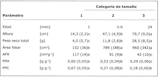 Tabla 1: Comparación de tres categorías de tamaño de plantines de B. excelsa usadas en este estudio al inicio del experimento. Los valores corresponden a promedios y desviación estándar de ocho individuos por categoría. Todos los parámetros, excepto la edad, fueron probados para efectos de tamaño en un Análisis de Varianza (P < 0,001 para todos los casos). Diferentes letras de superíndices indican diferencias significativas entre categorías (P < 0,05, prueba Tukey HSD). Para efecto de las descripciones de parámetros abreviados, veaTabla 2. Note que AFR y PPH han sido calculados sin incluir el peso del cotiledón.